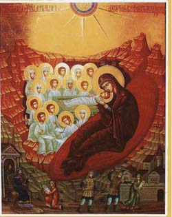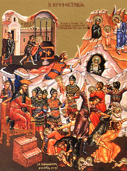 Orthodox iconography is very rich with depictions of this mass killing at the dawn of our salvation. These icons, several of which are shown in this post, give us a different, more sober perspective on the Christmas story. Many of the icons show the infants in the white garments of martyrs. But no matter how much we soften the blow of the story with visions of heaven, the darkness of the story remains. How dare Matthew spoil our good cheer by describing such a horrible incident?! And yet here it is, as a reminder that Christmas is not about Santa Claus, it’s about God entering into a world burdened with great suffering and evil.