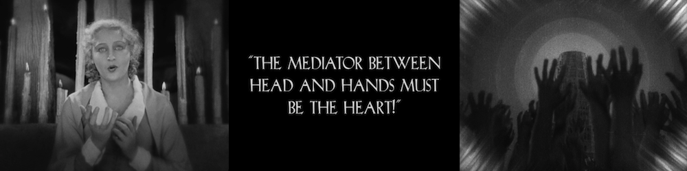 The primary message of the film shows up in the inter-titles (remember, this is a silent film) a few times, including the very end: Head and hands need a mediator. The mediator between head and hands is the heart. Wait for him, he will surely come!