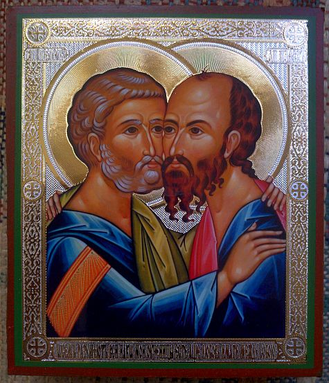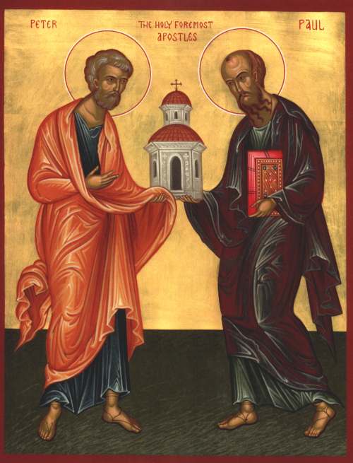 June 29th is the feast-day of Saints Peter and Paul, the two most renowned of the apostles. In the Orthodox tradition there are three primary icons of the two apostles. The first shows Peter and Paul together supporting a model church building: