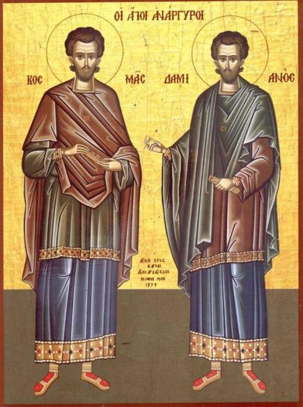 Saints Cosmas and Damian were twin brothers who lived in the 3rd century. They were physicians and are venerated among a whole group of saints in the Orthodox Church who are called “Unmercenaries” because they healed without receiving payment. And they not only attended to human illnesses, but they also healed animals.