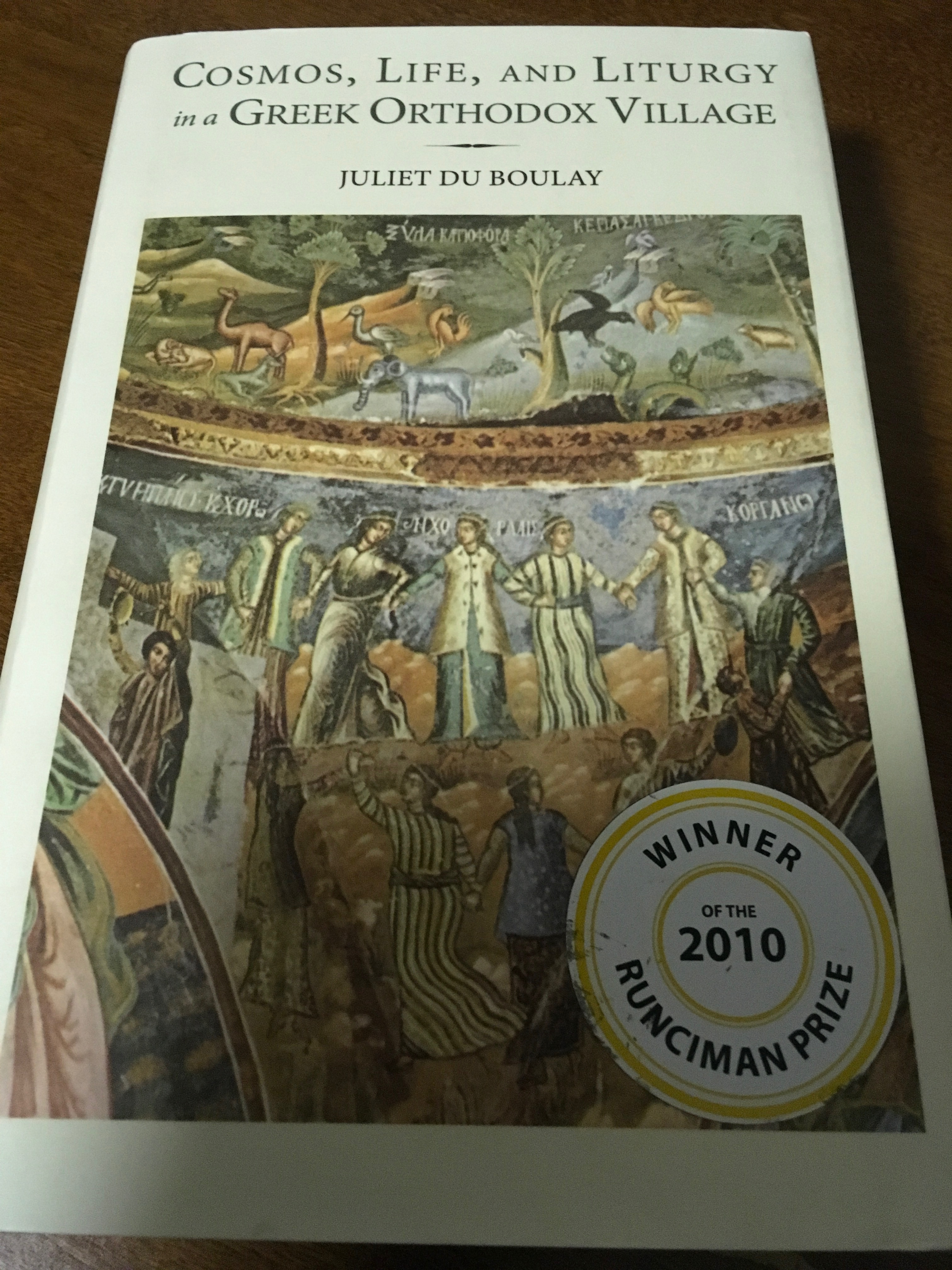 the land. It’s about recognizing our place in God’s universe. Juliet du Boulay wrote a second book about this same Greek village, Ambeli, a small, dying village in Euboea; a book with a very ambitious title, Cosmos, Life, and Liturgy in a Greek Orthodox Village. In the late 60s and early 70s this author lived in the village and experienced up close the unique bond between their physical existence on the land and their spiritual existence in the Liturgy and all the sacramental and sanctifying celebrations of the church year. Indeed, when you talk about the eastern Mediterranean you cannot separate physical from spiritual. They are uniquely inseparable.