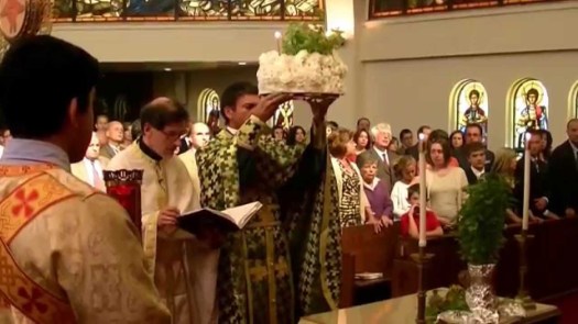 The high-point of the feast observance occurs at the end of Matins. The Great Doxology is sung and at the concluding portion a slow procession of the Cross takes place. The Cross is decorated with basil in the Greek tradition. (Flowers are also used: in combination with basil, or alone in parts of the world where fresh basil is not common.)