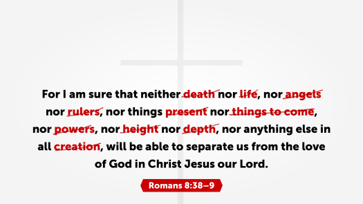 And indeed, don’t miss the words at the end: “in Christ Jesus our Lord.” The love of God is most fully revealed in Jesus Christ. He is the conqueror of every fear in our lives. Unite yourself to Christ and nothing will ever separate you from the love of God. Paul is not saying that nothing bad will ever happen in your life. He is saying something far more powerful: Regardless of what danger you face, regardless of what fear lurks in your soul – nothing will separate you from the love of God, the love of God in Christ! It is a powerful affirmation – the Bible verse to end all Bible verses!