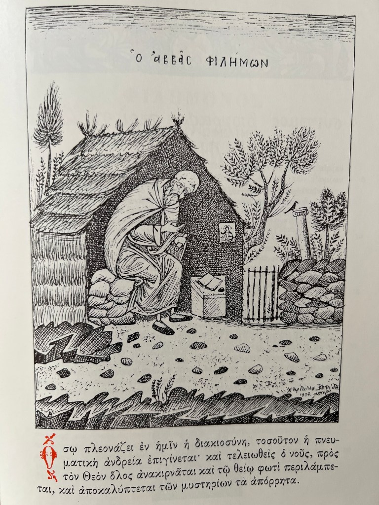 The saints walked lightly on the earth. Their carbon footprint was almost zero, if you want to put it in contemporary terms. In volume 2 of the Philokalia in the standard Greek edition there is a beautiful pencil-drawn icon of Abba Philemon, who lived perhaps around the year 600, that shows the simplicity of life that Jesus also lived, in touch with the earth with a lightness of step, in open communion with the trees and birds and in the midst of the ruins of civilization, represented by a solitary Corinthian column in the background. (Here is my photo of that page in the Philokalia.)